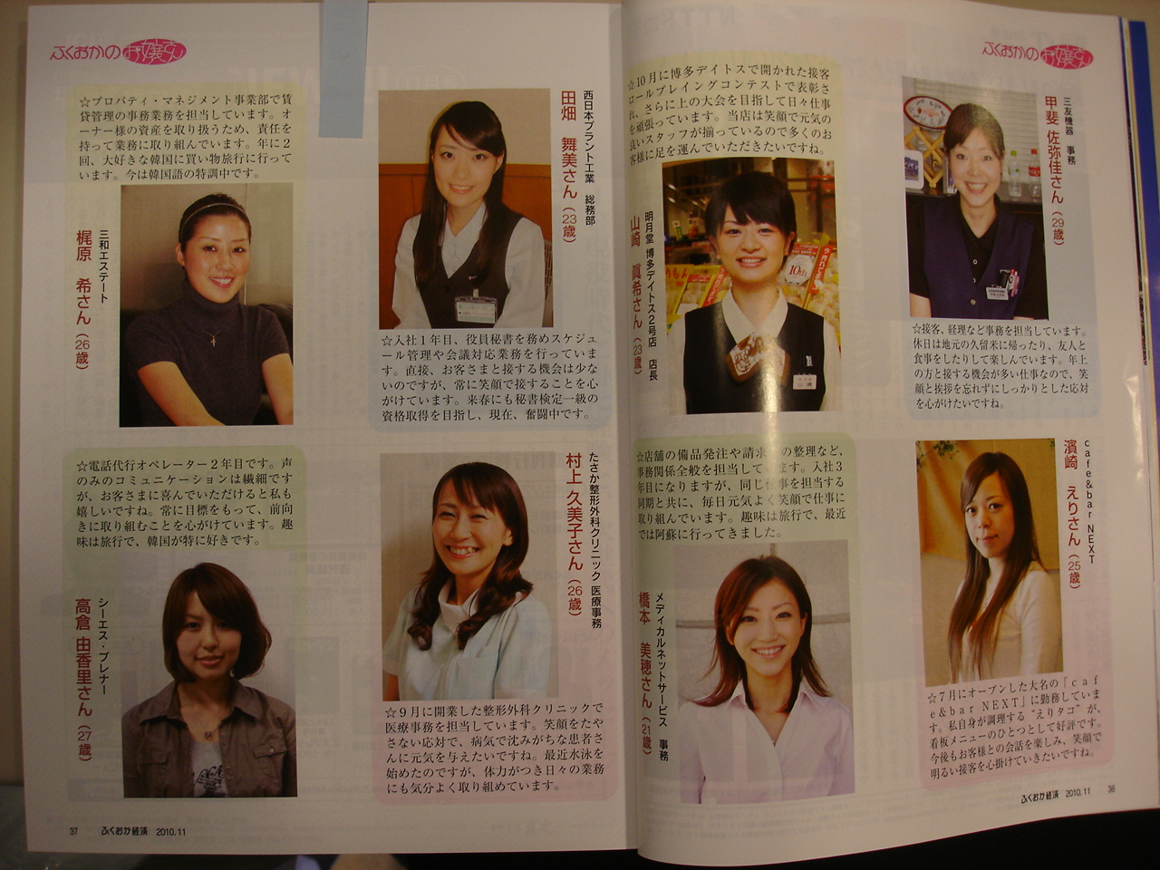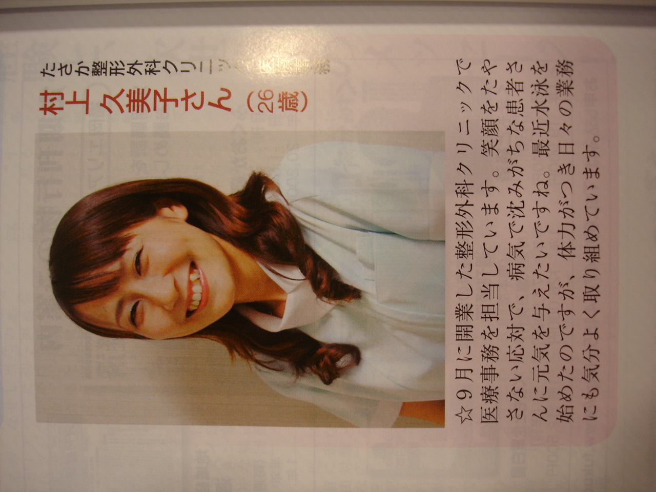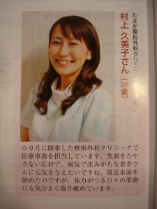 当クリニックの看板娘「くみちゃん」が、雑誌「ふくおか経済」の『ふくおかのお嬢さん』に掲載されました!!。突然の取材にも、いつもの笑顔で対応していたくみちゃん!。この笑顔で毎日患者さん方を癒してくれてます。