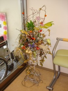 開院時にいただいた時は生花でした。このままずーっと置いておいてくださいと言われ、置いていると徐々にドライフラワーのアートに・・・!!。不思議です。